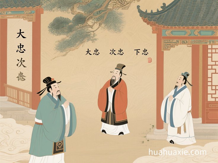 次忠《荀子》上说:“以道德匡正君主而辅佐他,是次忠。如管仲之于桓公。”《史记》评价管仲是贤臣,能发扬桓公的优点,匡正他的缺点。孔子评论管仲,说他辅佐桓公,称霸诸侯,一匡天下;但他的住宅与所用仆役奢华,可比君王,是不节俭以及违背礼制。