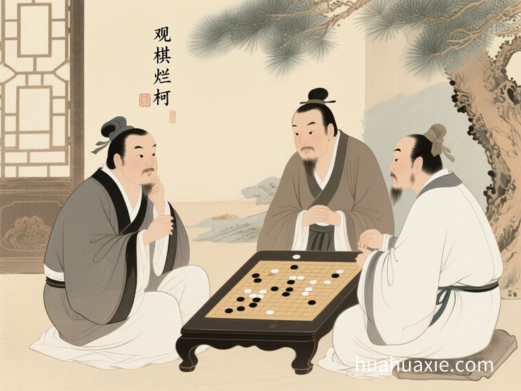王质看得非常入神,也不知道到底看了多长时间,那弈棋的童子突然抬头对他说:“你该回家了。”王质这才想起来自己是来砍柴的,便起身去拿斧子,一看斧柄已经腐朽溃烂了,那原本磨得明亮锋利的斧头,也锈迹斑斑,凸凹不平了。