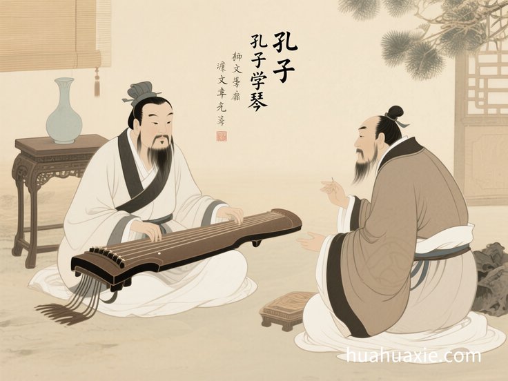 孔子是我国春秋时期伟大的政治家、思想家和教育家。他也喜欢唱歌、作曲,还能鼓瑟、弹琴,会弹奏好几种乐器。有一段时间,孔子跟鲁国的乐师师襄子学弹七弦琴。