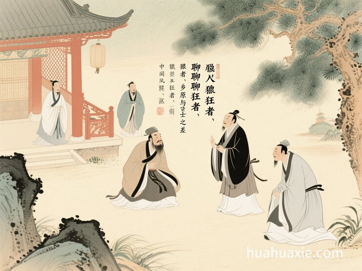 孟子是孔子之孙子思(孔伋)的弟子。孟子有个弟子叫万章。一天,万章问孟子道:“孔子在陈国时说:‘何不回乡呢!我们家乡的人狂放简单,积极进取,不忘初衷。’”“孔子在陈国,何思鲁之狂士(为什么思念鲁国的狂放之人)呢?”孟子回答:“孔子说过,找不到既不过分也无不及、符合中庸之道的人,那就只剩与狂者和狷者了。”章子又说了:我斗胆问一下,什么样的人可以称为狂士呢?孟子回答:“他们志向大而自满,动不动就说‘古代的人怎样,古代的人怎样。’而用常道考察他们的行为,却发现他们的行为赶不上他们的言谈。当连狂者也得不到的时候,那就只好找獧(狷)者了。”在上文中看,狂和獧两者是相对的。生活中的狂者,有高远志向却眼高手低;他们被发现言过其实的时候,会抱怨自己失意、不得志,也是一种推卸责任吧。獧者则因为谨慎狭隘而有些事宁死也不做。在现代汉语中,獧急、獧狭,指人胸襟狭窄、性情急躁,獧介、獧傲则指人洁身自好、性情耿直。总之,这两种人都比不上不偏不倚、不过也无不及的贤士(好人)。