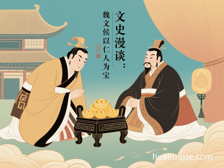 西汉刘向在《新序》中记载了这样一段故事,魏国臣子公季成有一次对魏文侯说:“田子方虽然是一位贤人,但并不是拥有封地的君王,国君您却常常以对待君王的礼节去对待他,那假如有一位比他还贤明的人出现,您又该如何奖赏呢?”文侯说:“如子方者,非成所得议也。子方,仁人也。仁人也者,国之宝也;智士也者,国之器也;博通士也者,国之尊也,故国有仁人,则群臣不争,国有智士,则无四邻诸侯之患,国有博通之士,则人主尊。”意思是:“田子方这样的人,可不是季成你能随意评论的。子方是一位品德高尚、富有爱心的仁义之士,仁义之士是国家的珍宝,多谋善断、运筹帷幄的智者是国家的栋梁之才,博览群籍、通晓百科的学者是国家尊贵的人。国家有了仁义之士,那么大臣们就不会争斗,国家有了智慧之士,那周边的邻国就不敢进犯,国家具有博学而通达的人才,就可以侍奉国君而受到尊重。”魏文侯是战国七雄之一——魏国的开国君王。司马迁在《史记》推崇魏文侯说:“是时独魏文侯好学。” 魏文侯对儒家学说非常尊崇,也十分注意自身道德的修养。在位时礼贤下士,对道德学问高尚的贤者求之若渴,非常尊敬。
